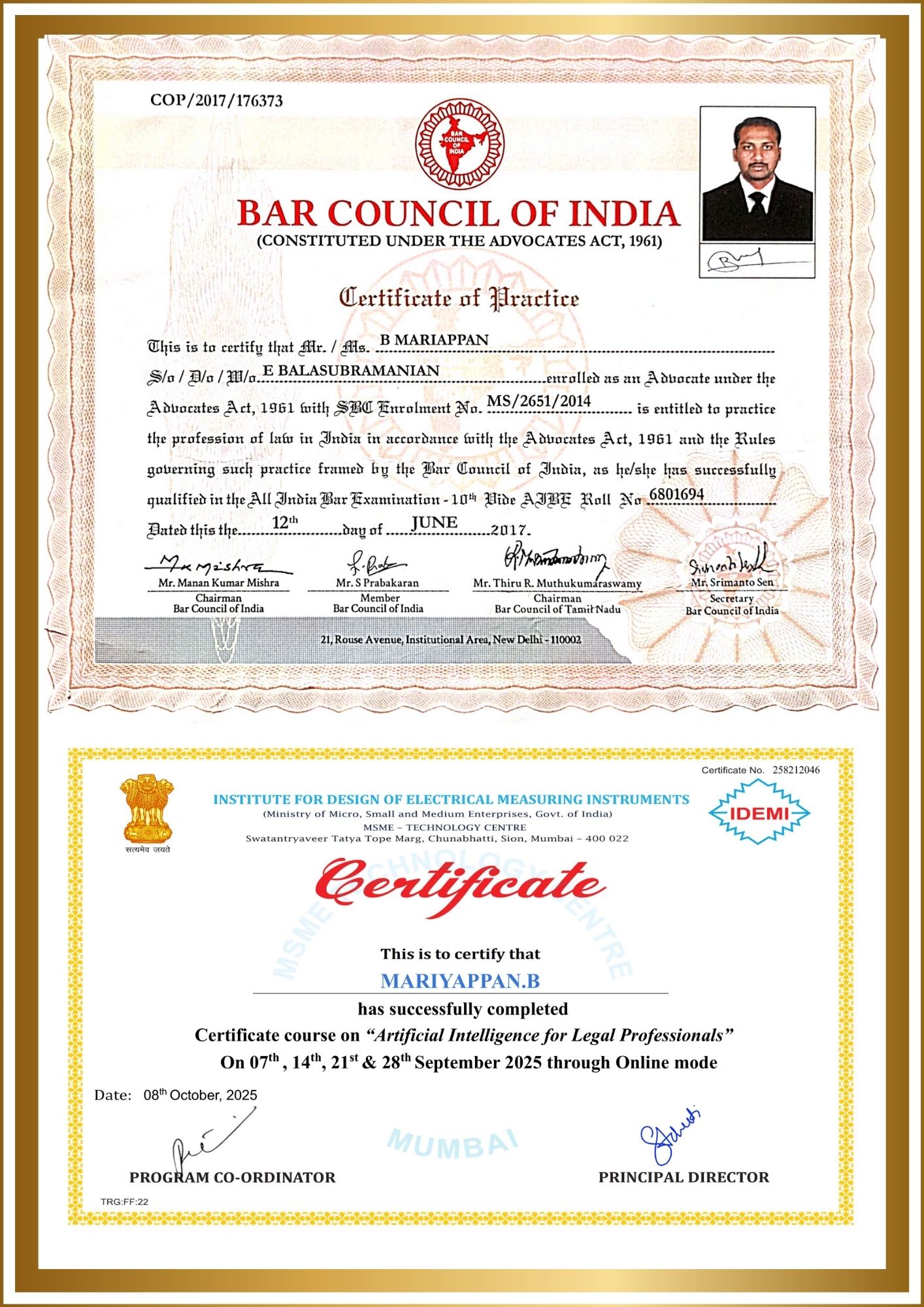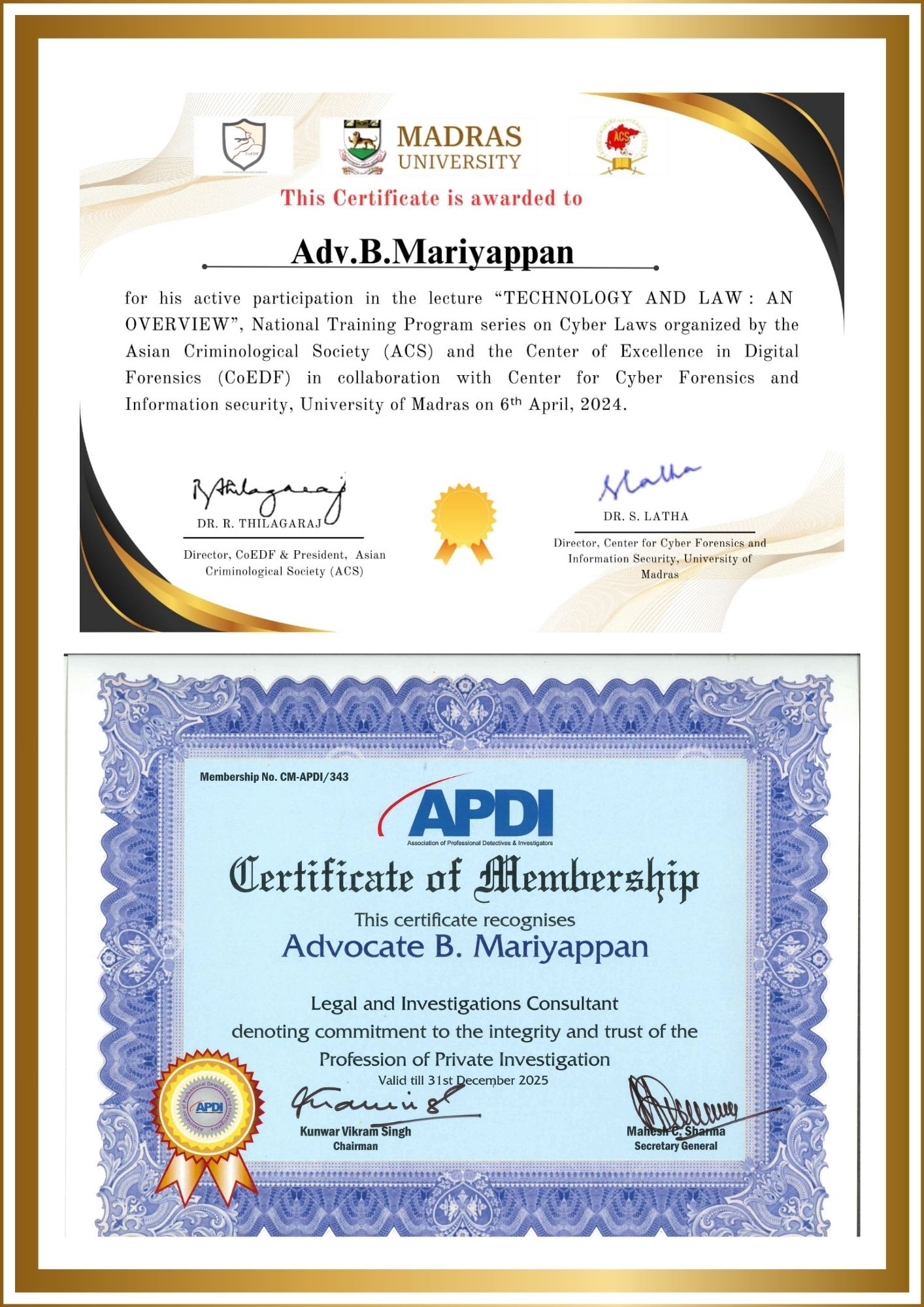 Advocate B. Mariyappan is a practicing Advocate enrolled with the Bar Council of Tamil Nadu & Puducherry, holding an LLB and pursuing PhD research in Criminology and Forensic Science. He delivers Legal Advocacy, Legal Advisor for Private Detective and Investigations Services, including cyber investigation and matrimonial matters, with a strong focus on evidence, legality, and confidentiality.